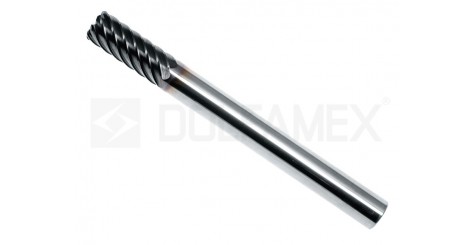 Frezy trzpieniowe DOLFA 6-HR z promieniem na narożu, do obróbki materiałów o twardości do 63 HRC, odmiana długa, chwyt walcowy gładki. Od 4 do 8 ostrzy w zależności od średnicy narzędzia. Linia śrubowa rowków wiórowych λ=45°, promieniowy kąt natarcia γ=2° oraz sztywna konstrukcja pozwalają na wydajną obróbkę wykończeniową materiałów twardych i uzyskiwanie bardzo dobrej jakości powierzchni obrobionych.